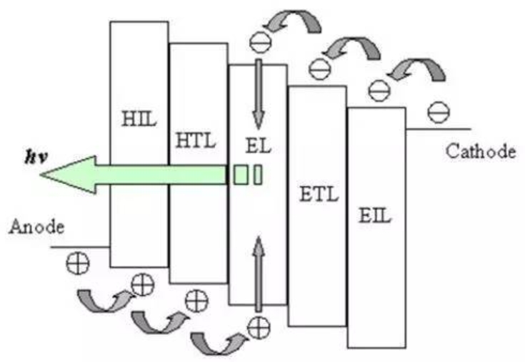 典型的OLED器件由多層功能結(jié)構(gòu)組成,包括陽(yáng)極(Anode)、空穴注入層(HIL)、空穴傳輸層(HTL)、有機(jī)發(fā)光層(EL)、電子傳輸層(ETL)、電子注入層(EIL)及陰極(Cathode)。這些層通過(guò)設(shè)計(jì)形成“階梯式”能級(jí)分布(圖一),促使來(lái)自陽(yáng)極的空穴與陰極的電子高效傳輸至發(fā)光層結(jié)合并釋放光子。通過(guò)摻雜(Dopant)技術(shù)(表一、表二),可精準(zhǔn)調(diào)控各層材料的能級(jí)狀態(tài),從而提升器件效率與壽命。